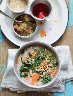 On my first morning in Kengtung, the cultural center of the Tai Koen people in the eastern part of Shan State, I stared at a pale pink-mauve mass, like tinted soft polenta, that steamed in the cool morning air, and couldn’t imagine what it was. The vendor at the small morning market saw my puzzlement, so she scooped out a ladleful, poured it into a bowl, and handed it to me with a spoon and a “taste it, go ahead” gesture. Smooth on the tongue, rich-tasting . . . it took a m
