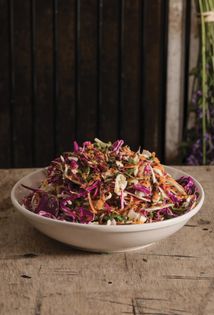 Put the shredded cabbage in a very large mixing bowl with the onion and grated carrots. Mix well with your hands. Toss in the toasted seeds, the chopped parsley and the baby spinach or rocket and mix again, then pour over the slaw dressing and toss slowly and leisurely until everything is glistening. Taste to see if any additional seasoning is needed.