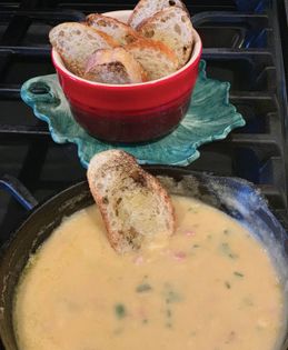 Puréed cannellini beans, fontina and Parmigiano-Reggiano cheeses, pancetta, and sage warmed in a cast-iron skillet become a tasty dip that partners well with grilled or toasted Italian bread brushed with olive oil and rubbed with garlic. And to drink? Perhaps a crisp glass of chilled