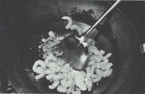 Heat the oil in a wok. Stir-fry the shrimp quickly to coat them.