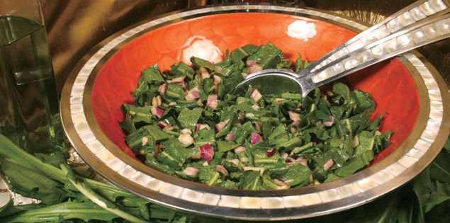 Dandelion greens are one of the most nutritious leafy vegetables. Alone they have a slightly bitter flavor, but when they are mixed with red onions, kishk, and olive oil, they are absolutely delicious with a peppery bite.
