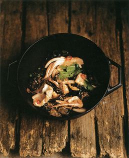 The peculiar Judas’ Ears in this recipe perfectly complement the shiitake and squid. Auricularia, wild or cultivated, are much used in Chinese and Japanese cooking, but very little in European. Indeed, this recipe leans towards the cuisines of the Far East in its use of spices and herbs. It is an interesting way of using mushrooms and can perhaps be accompanied by a little freshly boiled sticky rice.