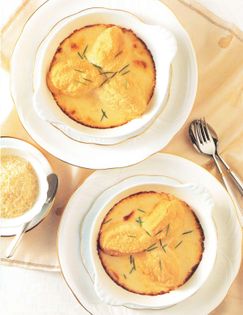 These light-as-air cheese puffs are rightly called soufflés, despite their unconventional sabayon-type base. They are served floating on a rich cheese cream, called a fondue after the French ivord for melt.