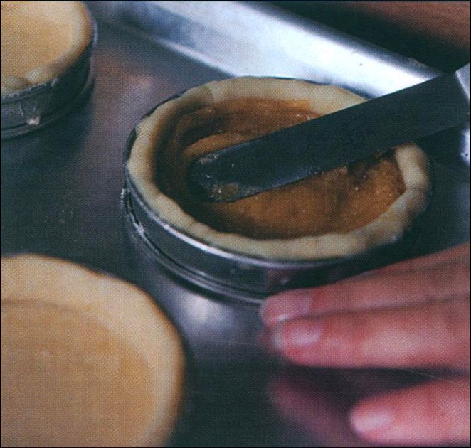 Spread a thick layer of Frangipane over an unbaked pastry-lined tartlet ring.