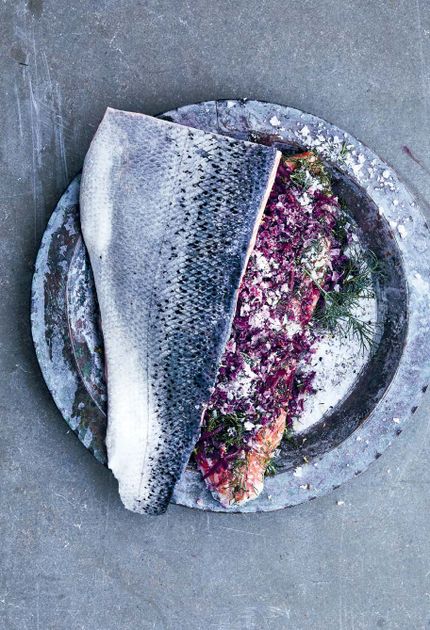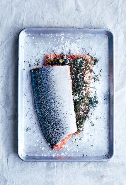 Gravlax is traditionally served at Easter as well as Christmas. The classic herb is dill with lemon zest. The modern touch is to add raw shredded beetroot to the cure. On slicing the beet-cured salmon, you will have a deep red colour followed by the orange of the salmon.