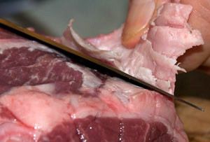 Cut away the thin skin from the top of the lamb, leaving the pure meat exposed. Bone the lamb as shown or have it done by the butcher.