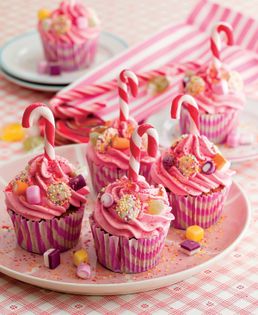 Bite into these cupcakes and you will find pretty pink-and-white marbled sponge. Be bold with the pink colouring — the effect is always less than you expect when the cakes are cooked. Choose a selection of your favourite old-fashioned sweets to decorate — jellies, candy-coated chocolates, sherbets — and top with a lollipop or candy cane.