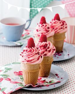 Flat-bottomed ice cream cones make a fun alternative to cupcake cases for a party. It is simple to make the fresh raspberry purée for the buttercream, but you can use frozen raspberries or a ready-made lightly sweetened raspberry sauce instead.