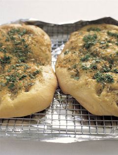 These are something between garlic nan and herby focaccia: dimpled, doughy and headily pungent. When lunch is cold and sparse – some sharp cheese, some sliced tomatoes, a green salad – these bring everything substantially, chin-drippingly together. (But please try making them once to eat with fried eggs and maybe some fried or grilled tomatoes.)