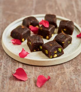 The traditional Indian recipe for almond barfi calls for blanched or soaked almonds, peeled, then ground to a paste that’s cooked in condensed milk or sugar syrup. I’ve swapped the condensed milk and sugar syrup for ghee and jaggery, of course, and in addition to saffron I’ve included pistachios and rose extract to flavour – both expensive but that’s what makes this sweet an absolute delicacy! Remember nuts should be eaten in small amounts, so just one piece is enough.