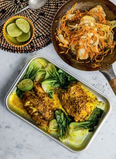I don’t have a tandoor (a type of clay oven), but I do like tikka – usually small pieces of meat or fish in a spicy marinade, baked in said oven. This adaptation is a deliciously easy fish dish that I can pop in the oven while I prepare a stir-fry of veggies, making it perfect for entertaining. In India the tikka marinade is made with yoghurt and spices, but since yoghurt with fish is an Ayurvedic ‘no-no’, I’ve swapped it with ghee, which helps to activate the spices as well as baste the fi