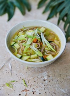 This is a clean-flavoured dish that’s reminiscent of a lot of simple Japanese cuisine – this kind of dish balances out the more unctuous dishes that I love. It’s like an Asian version of my Spring Clean Vegetable Brown Rice Soup, made using buckwheat soba noodles and miso and ginger for flavour.