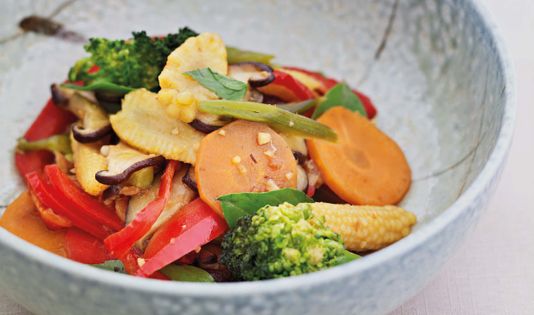 The bright, sweet and sour flavors of tamarind come alive in this simple stir-fried veggie dish. Use whatever fresh vegetables you like but I think this colorful combo has great mix of flavor and texture. You can also add your favorite meat to turn this side kick into a main event. My friend Terry likes to add diced tofu and edamame for a boost of soy protein especially when she knows she’ll be working out later that day.