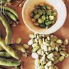 If fava beans are in the market, you know it’s spring, or spring somewhere nearby. Their giant green pods look like something strange and juicy, perhaps from another planet. In fact, they are the original Mediterranean bean. Early favas are small and tender; they get starchier as the season progresses. Favas are more than a little fussy to peel, but peel you must to appreciate them fully. Fresh fava beans are so good, though, they are worth the effort.