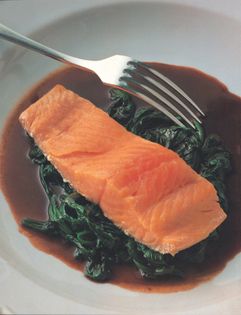 We call the fish ‘coddled’ because, just as a coddled egg is never boiled, and is cooked at a lower temperature than a boiled egg the same technique is used in cooking the salmon to prevent the protein hardening. By cooking the salmon at a low temperature the protein remains soft and when you eat the fish it literally melts in the mouth. Goose or duck fat is available in tins from specialty shops. If it is unavailable, you can substitute a good quality virgin olive oil. Maintaining the fat