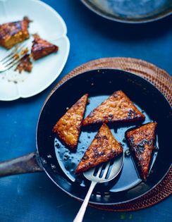 Because of tempeh’s nutritional credentials, you can find it in most health food shops. This Indonesian staple is a firm vegetarian protein made of fermented soya beans, but don’t dismiss it as beige and bland. Unlike tofu, it is textured with the whole beans and has a savoury, nutty edge. Here it is twice-cooked, first braised to infuse with sweet spice and then fried to crunch and caramelise the edges. The combination is irresistible.