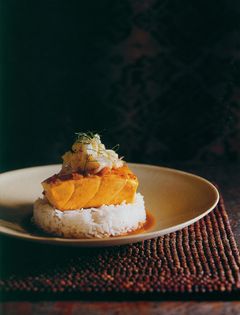 I sometimes serve this curry with steamed jasmine rice that has loads of finely shredded fresh herbs added to it. The best leaves to use are turmeric, Vietnamese mint, Asian or lemon basil, coriander and makrut lime. I also add fine shreds of torch ginger or pink ginger blossom when I can get hold of them. The rice complements the tangy flavours of the curry sauce perfectly and the pineapple sambal balances the sourness of the tamarind.
