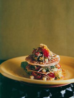 I have adapted this classic Lebanese salad to my own style. Instead of tossing the bread through the salad in the usual manner, I have made wafer-thin layers between the salad, creating a sandwich effect with a wonderful textural contrast.