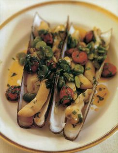 Razor clams are an odd kind of shellfish not often seen on the fishmonger’s slab. I first tried them in Spain, cooked very simply, and I’ve since discovered that simply is the only way to prepare these phallic-looking molluscs. It’s important to use the soft cooking type of chorizo for this, as opposed to the hard dry sausage that is sliced and eaten as it is.