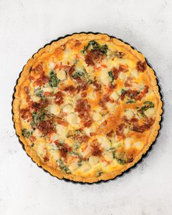 Between the perfect pastry crust and the creamy filling of egg with goat cheese, shrimp, scallops, caramelized onion, and pancetta, this might be the perfect bite of food. A quiche is something that looks simple, but has some serious technique involved in the preparation. I mastered the art of quiche while working in a French bistro, and trust me when I tell you, making three a day will make anyone an expert. The ratio between egg, cream, and goat cheese makes the perfect texture inside. I