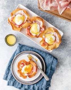 It had been years since I’d had runny poached eggs with fatty hollandaise sauce perched on top of a toasted English muffin. Reason being is because we don’t eat gluten at home, but one day I decided to bake a cauliflower thin in a muffin tin and the idea for this recipe was born!