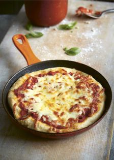 OK, this may not be as quick as pizza delivery, but it’s the fact that it’s homemade which is important. The difference with this pizza as opposed to others, is that there’s no waiting around for the dough to rise; it just goes straight into an ovenproof frying pan, topped with whatever you fancy, and baked. The heat from the outside of the pan acts like a heat blanket around the dough, making it light and airy as it cooks.