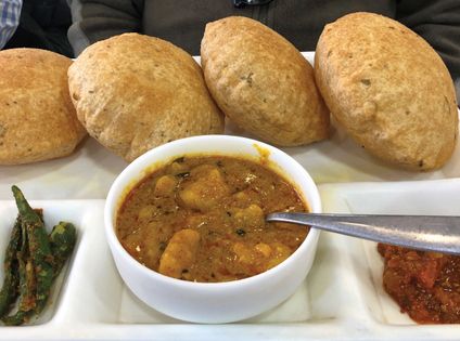 Poori, pronounced “poo-ree,” is a deep-fried puffed bread, generally prepared from wheat flour. The dough can be prepared in advance, but rolling and frying should be done just before serving. Poori are fried in bubbling hot oil and puff up into steam-filled, light-brown balloons. Poori tastes best if eaten piping hot, puffed up with a crispy outside and a moist inside. Though it starts to lose its puffiness and becomes somewhat chewy and tough when cold, poor