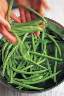 If the green beans are very long, cut them in half. Drop them into a bowl of cold water so that they are completely submerged. Leave them to absorb the water for a few minutes.