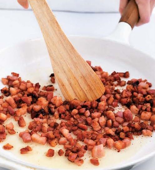 1 Heat the vegetable oil in a deep frying pan and fry the bacon lardons until crispy. Transfer to a plate lined with kitchen paper to drain, and allow to cool.