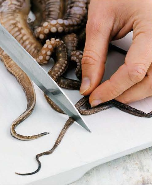 1 Wash the octopus tentacles thoroughly in a large bowl of cold water. Trim off the very thin tips of the tentacles.