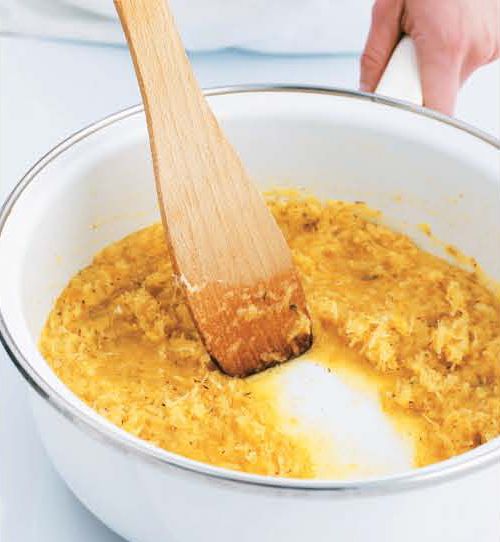 2 Remove from the heat and add the coconut, orange juice, and the orange and lime rind. Mix briefly, then add the egg yolk and stir well.