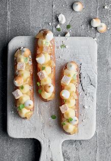 , spoon the choux pastry dough into the pastry bag with a ¾-in. (1.5-cm) tip. Pipe 10 × 6-in. (15-cm) logs onto the cookie sheet.