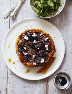 This is a twist on the classic tarte tatin as it is made not with fruit, but with onions – deliciously sweet red onions, to be precise – using more or less the same principle and technique. To go with my onion tart, I have chosen goats’ cheese, which for me is the perfect partner, and I have also created these as individual tarts, which means they are ideal for serving as a meal for a first course or lunch, and make a lovely dish to serve outdoors, sitting on the terrace or in your garden.