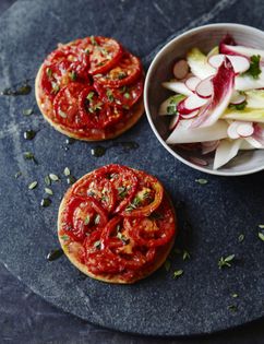 This classic tart represents, for me, all that I love about the Mediterranean, such as the climate, the colours, the heat, the scents and the goodness of the fresh local and seasonal ingredients. My new additions of tomato confit, chilli and lemon thyme give a freshness and great depth of flavour. You could also top the tarts with a few rocket (arugula) leaves.