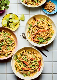 This is possibly one of the longest lists of ingredients for any recipe in this book, but I think it’s worth it. Most of the ingredients are found hanging around the fridge or storecupboard shelves. As with any stir-fry dish, the key is to prep everything before you start cooking so that nothing burns while you’re chopping. Noodles, peanut butter, lime, soy and peas are, for me, real comfort food – salty, sweet, umami and sour all in one mouthful.