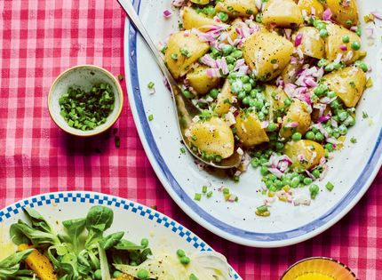 Because I don’t like a sloppy potato salad, this one is lightly dressed, but you can add more mayo, if you like. The lemon juice dulls the peas, so if you want a pop of vibrancy, defrost the peas separately and fold through before serving.