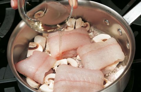 Fillet the fish into 4 pieces, reserving the bones; you will use them to make stock. Store the fish in the refrigerator until ready to cook. To prepare the garnish, remove the stems and any brown parts from the mushrooms and se