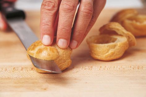 Using a serrated knife, split the pastry rounds crosswise into two equal parts. Keep each pastry round together so that you have an even fit once filled.