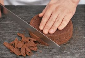 Using a serrated knife, even off the top surface of the cake. Then cut the cake crosswise into 3 layers of equal size.