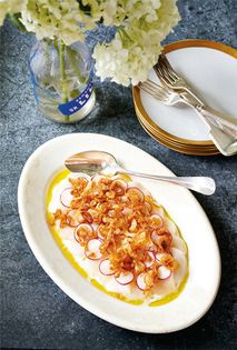 I can’t leave scallops out of the Normandy shellfish conversation—the coquilles St. Jacques from the Calvados region, harvested only in the cold-weather months, are coveted throughout France. Back home, of course, we have some pretty great scallops to work with, too, and I love them sliced thin and raw, or cru. This dish is a pretty accumulation of circles, but the radish slices and the bittersweet scallion rings serve another purpose: Scallops can be easily overwhelmed, and s