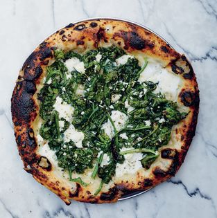 Watching through the oven door as the pile of spinach on top of the pizza cooks down and the dough slowly becomes covered with salty feta and creamy mozzarella is, simply, rad. We use an heirloom variety of spinach called Bloomsdale, which has very curly leaves that char on the edges in a beautiful way as they cook.