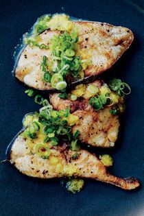 Mackerel might be my favorite fish to eat and it is so versatile to prepare. We serve it raw, smoked, pickled, sautéed, and grilled and I find that no one way is better than any other. This recipe, in which mackerel is grilled on the bone, is suited to fillets cut from a 5- to 10-lb [2.3- to 4.5-kg] fish often sold as king or Atlantic mackerel, or sawara in Japanese markets. The small bones in this cut are easily removed with tweezers after cooking or picked out as you eat. Leave the