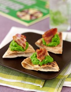 Sweet green peas make a wonderful purée base, and the flavor is brightened by fresh mint and accented with crisp pancetta. For a vegetarian version, omit the pancetta and top the spread with thin crispy fried slices of shallot.
