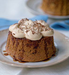 These moist, featherlight chiffon cakes pack a strong coffee punch thanks to the coffee extract and the Kahlúa liqueur. The incomparable caramel-like flavor of the dulce de leche whipped into the creamy topping and a light dusting of chocolate are delicious complements to the deep coffee flavor.