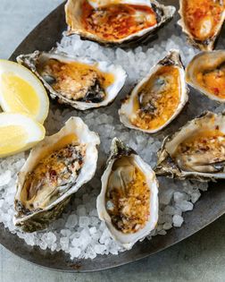 For grilled oysters, choose small- or medium-sized, and cook them on a charcoal or gas grill over direct heat. The simplest method is to place unopened oysters on the grill grate and let the heat from the grill pop them open, then add the sauce or butter when serving. At Hog Island, we prefer to shuck the oysters first and add a little sauce or butter to each oyster before putting on the grill.