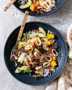 Squid takes on a lovely smoky flavor when grilled, but this Thai-inspired recipe can also be cooked under a broiler. It’s a refreshing main-course salad on a warm day, or perfect picnic fare when served in individual “to-go” boxes.