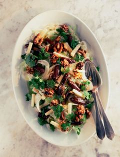 Combine the celery and fennel in a bowl and toss with the lemon juice to prevent discoloring. Add all the remaining ingredients and toss well.