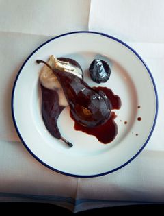 In a large saucepan over very low heat, combine the red wine, sugar, cloves, star anise, cardamom, and cinnamon sticks. Add the pears and poach them until they are soft but still hold their shape. Take them out of the syrup with a slotted spoon and let them cool.