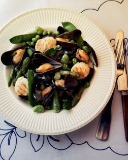 Bring a pan with water to a boil. Add apinch of salt. Trim away the bottom hard part of the asparagus and blanch for 2 minutes. Rinse under cold running water and cut diagonally in three parts. Then blanch the green beans for 2 minutes and rinse immediately under cold running water. Blanch the garde