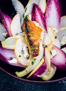 Separate the chicory leaves, peel and slice the pears and break the cheese into thumbnail-sized chunks. Place everything into a serving bowl, add the capers, cove